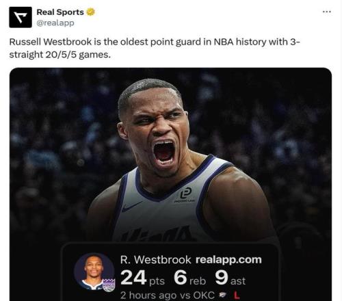 此役,威少还创下了纪录。数据显示,威少已经连续三场砍下至少20分5板5助攻,为做到这点历史最老后卫(36岁361天)。