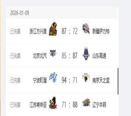 CBA常规赛,1月9日晚上安排了4场比赛,其中浙江广厦队主场87-72战胜新疆队、北京首钢队主场85-87不敌山东高速、江苏队主场71-88不敌辽宁队、宁波队在主场以94-71大胜南京同曦队。这几场比赛过后CBA排名前四的球队变化不大,辽宁队则是在一波三连胜后重回前八。