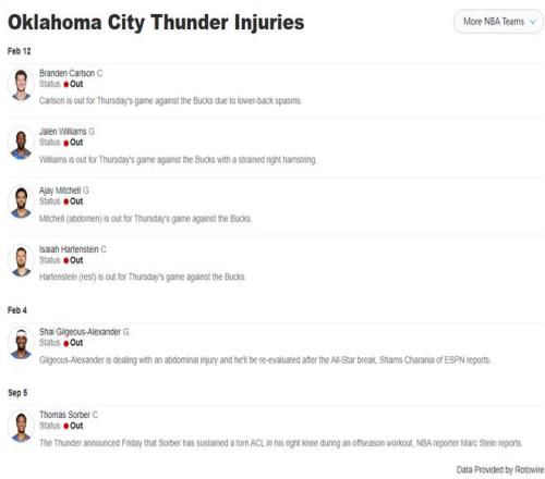 亚历山大自2月5日起就因为腹部拉伤缺席,他的伤势也是在全明星周末后才复查,他肯定让自己这个赛季至少出席65场比赛,因为他还想连庄MVP,但也有再度受伤的风险,这是一个巨大的隐患。